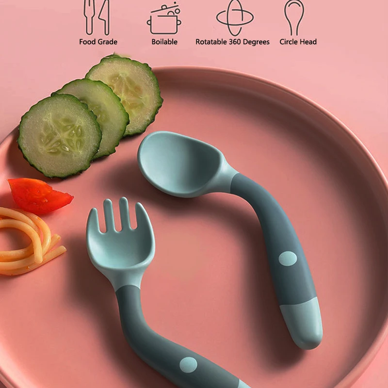 Name: Cuchara de silicona para bebé, tenedor auxiliar de comida para niños pequeños, aprender a comer, juego de utensilios de entrenamiento, vajilla de alimentación flexible para niños pequeños